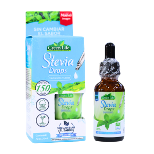 Botella de gotas de stevia Green Life de 30 ml, un edulcorante natural sin calorías. La presentación incluye un diseño atractivo y un envase que resalta su uso práctico en la cocina. Ideal para endulzar bebidas y alimentos sin alterar su sabor original. Contiene 150 dosis, lo que lo convierte en una opción conveniente para quienes buscan alternativas saludables al azúcar.