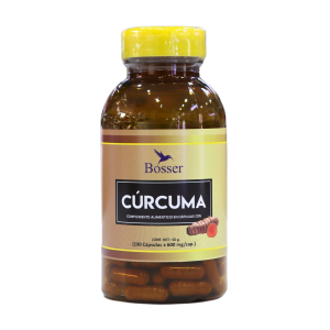 Frasco de suplementos de cúrcuma de la marca Bosser. Contiene 180 cápsulas de 602 mg cada una, diseñadas para apoyar la salud y el bienestar. La cúrcuma es conocida por sus propiedades antiinflamatorias y antioxidantes. Ideal para quienes buscan un complemento alimenticio natural.