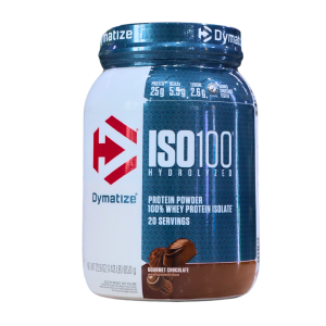 Imagen de un envase de proteína en polvo Dymatize ISO100 Hydrolyzed, que contiene 25 gramos de proteína por porción, 5.5 gramos de BCAA y 2.6 gramos de leucina. Sabor a chocolate gourmet y ofrece 20 porciones. Ideal para quienes buscan un suplemento de proteína de alta calidad y fácil digestión, perfecto para deportistas y entusiastas del fitness.
