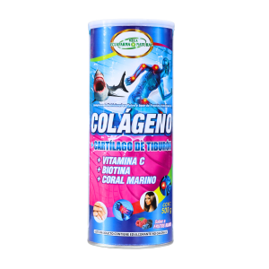Suplemento de colágeno en polvo con cartílago de tiburón, vitamina C, biotina y coral marino. Presentación en envase de 500 gramos, ideal para mejorar la salud de la piel, cabello y articulaciones. Producto diseñado para promover la regeneración celular y fortalecer el sistema inmunológico. Perfecto para quienes buscan un suplemento nutritivo y natural.